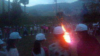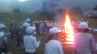 キャンプファイヤーでは、綺麗な炎の中、係が中心になってレクリエーションを盛り上げました。