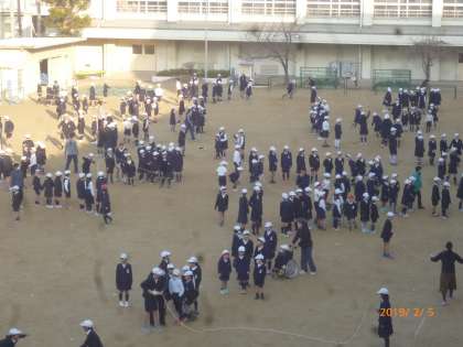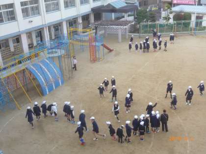 「おはようなわとび」の様子です。たてわり班で長縄にチャレンジしています。