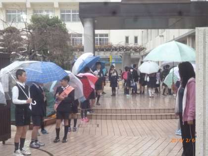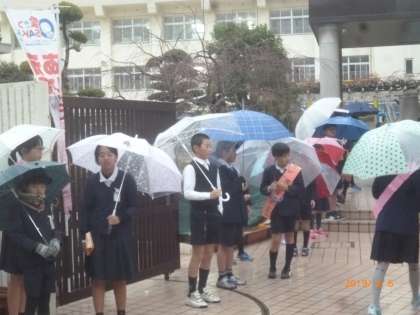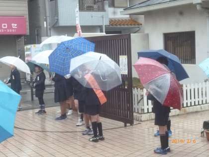 今日は、朝から雨が降っています。朝のあいさつ運動の様子です。