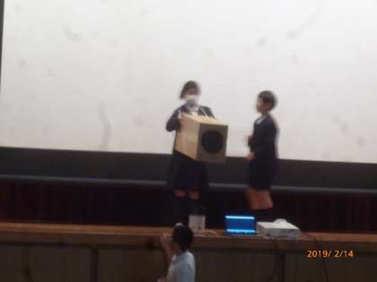 科学クラブの発表です。空気砲、発射!