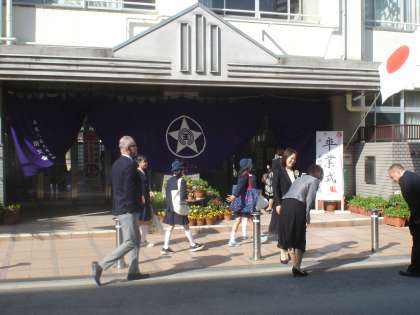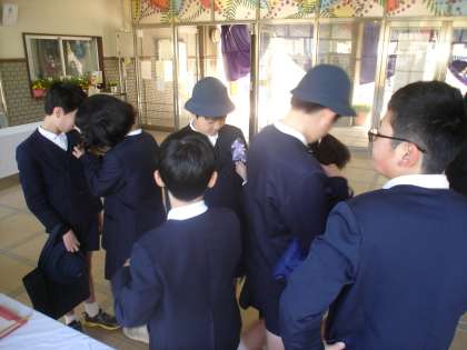 朝の学校前、5年生からの胸花の飾りつけ、6年生入場です。