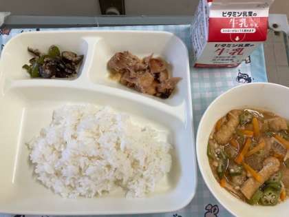 なすのそぼろいためは、なすをひき肉と一緒に甘辛くいためています。なすが苦手な児童もひき肉のうま味でごはんとよく合うと言って食べてくれていました。
