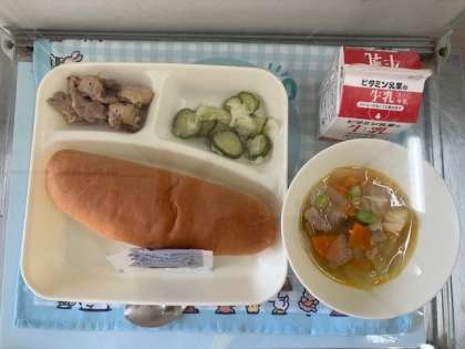 鶏肉のバジル焼きは、バジルの香りがよく食べやすく好評でした。児童はジャムをつけて食べるコッペパンが人気で1年生は完食でした。