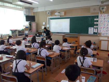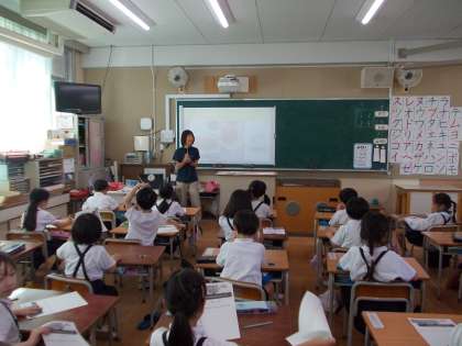 いつも食べている給食がどのように作られているのかを、写真を見ながら説明を聞きました。毎日暑い中、給食調理員さんたちが1000人分作っていることや、たくさんの材料を大きなお鍋で調理している様子を見て、驚いた1年生。