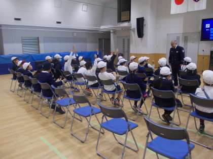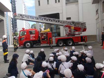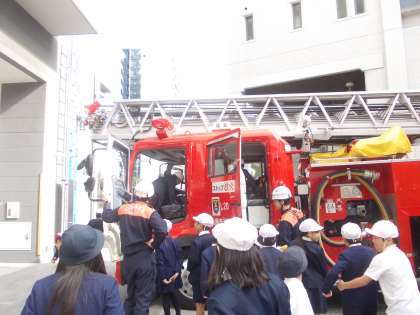 福島消防署に見学に行きました。はしご車の運転席に乗らせていただいたり、はしご車に装備されているものを見学させていただいたりしました。さらに、DVDを鑑賞して、火を消すだけでなく、通信指令室や救急なども連携していることを知りました。また、「水はどれだけ出せますか」「このボタンを押したらどうなるのですか」などを質問している児童もいましたし、「すごい」「初めて知った」などの声も多くありました。
