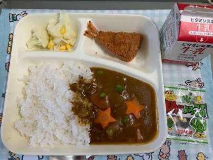 牛肉を主材としたカレーに、えびフライが添えられたカレーライスは大好評でした。カレーの中のにんじんは一部型抜きされていて、「ラッキーにんじん」と呼ばれています。