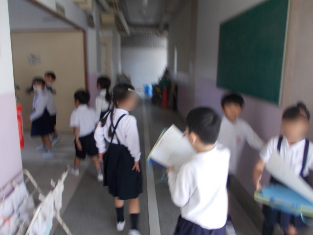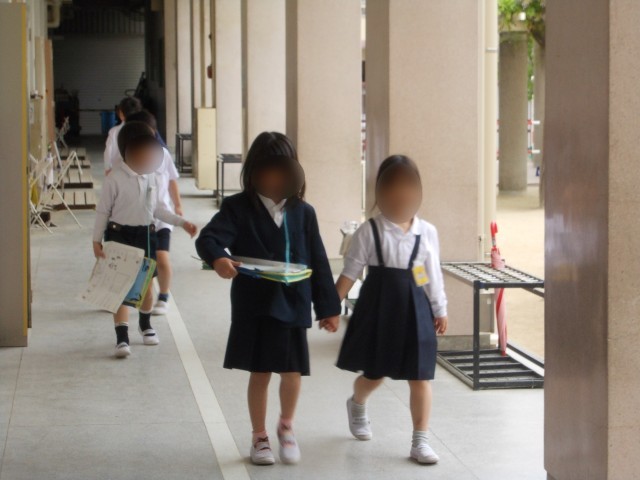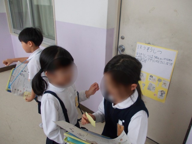 2年生の児童が、1年生の手をひいて