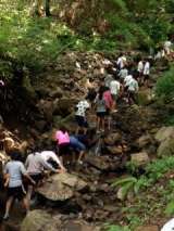 開舎式の後、避難訓練を行い、魚つかみをしました。魚も必死です。なかなか捕まりませ...