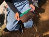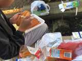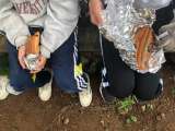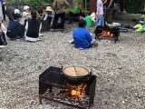 アルミ箔で包んだ具材を牛乳パックに入れ、火をつけます。完成まであと少しです。