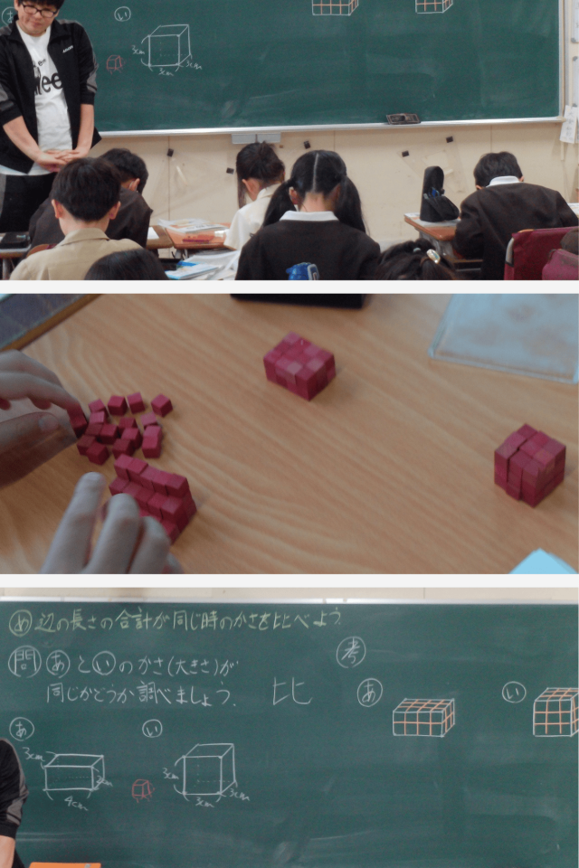 1立方センチメートルの積み木を使い、同じ長さの辺を組み合わせながら、辺の長さの合計が同じ2つの立体のかさを比べました。