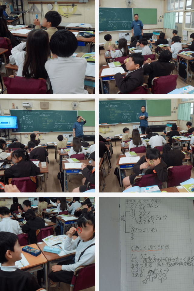 理科では、春の生きものを探す活動に向けて、虫めがねの使い方を学習しました。