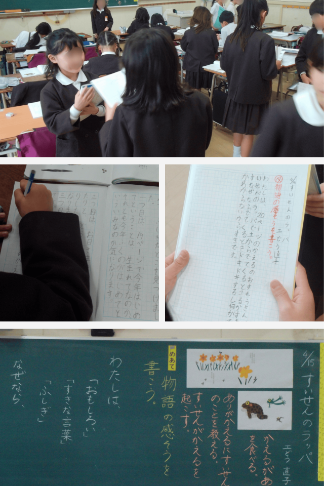 その後は、書いた感想を友だちと交流しました。同じ場面でも感じ方が違うことに気付いたり、「なるほど、そういう考えもあるんだ」と新たな見方に出会ったりするなど、学びが広がっていきました。