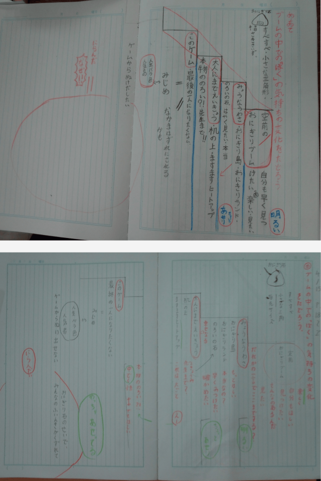子どもたちは、出来事の移り変わりに沿って文章を丁寧に読み返しながら、「ぼく」の心の動きを言葉から捉えていきました。