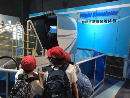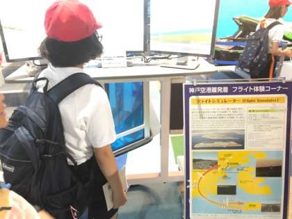 神戸空港での離着陸体験ができるフライトシュミレーターが人気です。予約して並んでいます。