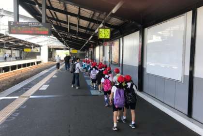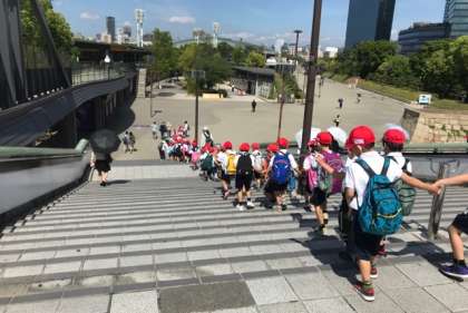 しっかりマナーを守って電車に乗れました。大阪城公園駅に到着。まずは天守閣に向かいます。