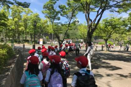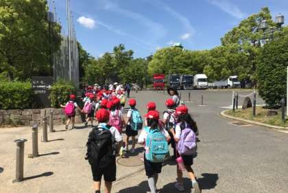 大阪城天守閣が見えてきました。「見えた!」と歓声も聞こえました。