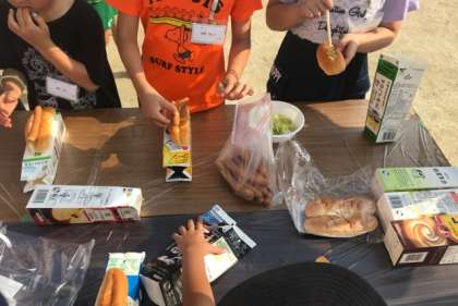 パンにキャベツとソーセージを挟み、牛乳パックに火をつけて、燃え尽きたらできあがりです。