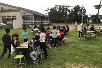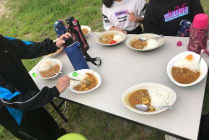 屋外で琵琶湖を眺めながらの夕食。贅沢なカレーはとても美味です。