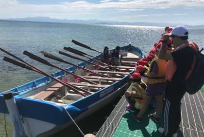 櫂をカッターに積んで、リーダから乗り方とうの説明を受けています。