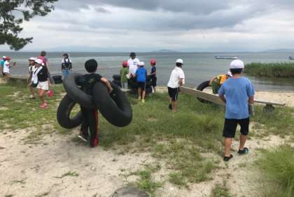 いかだ作りチームは、まずは材料を湖岸に集めています。