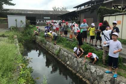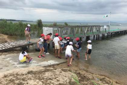 自然観察チームは、湖水に明日をつけて小魚の群れを観察したり、ザリガニ釣りにチャレンジしたりしています。