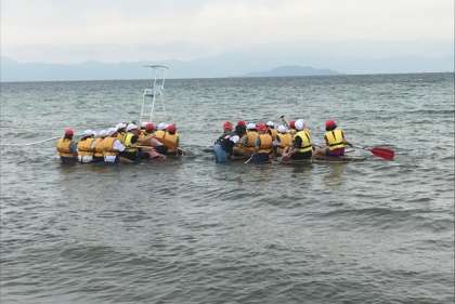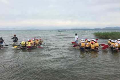 4チーム対抗の、壮絶ないかだリレー競争が始まりました。風もあって悪戦苦闘ですが、楽しそうな歓声が湖面に響いています。