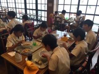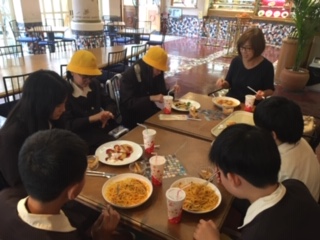 アトラクションに乗る前に、昼食です。グループでお店を選び、ミールクーポンが使えるメニューから各々好きなものを食べています。
