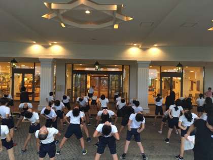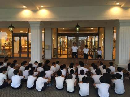 あいにくの小雨の朝です。本来なら昨日、避難訓練時に集合した場所での朝のつどいでしたが、玄関前で行なっています。