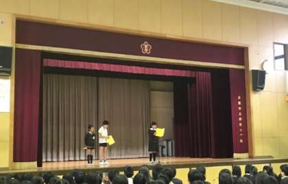 まずは、講堂での始業式。気持ちも引き締め、新しい年の学校生活がスタートです。校長先生からの話、生活指導担当の先生からの話につづき、今回は4年生から3名の子どもたちが代表として、新年の抱負をみんなの前で発表してくれました。
