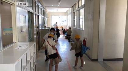 子どもたちは、まず、廊下で担任の先生に健康観察票を提出し体温チェック。
