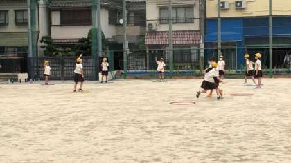 運動場と講堂に分かれて、フラフープを使ってちょっとした運動をしていました。
