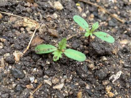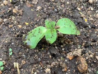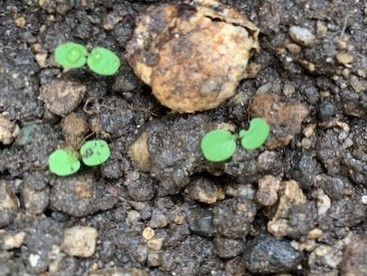 学校休業中の4月の終わりに、3年の先生3人で、学習園にこの3つの種類のたねを植えました。そしたら、ちゃんと芽が出ていたんですよ。