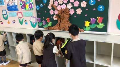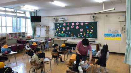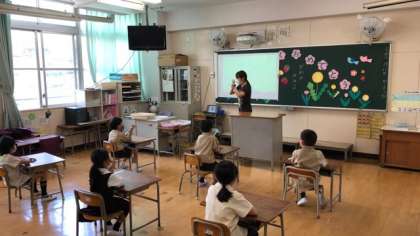 ・手の洗い方(黒板のスクリーンには動画が流れています)