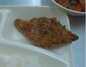 この日の献立は、まぐろの磯風味フライ、大根と厚揚げの煮物、プチトマト、ごはん、牛乳でした。今回のフライは、衣に青海苔を混ぜ込み磯風味と名付けられています。このフライ、実は、一つ一つ手作りです。670人分のまぐろに下味をつけ衣をつけて揚げています。給食調理をするメンバーは、まぐろの身が崩れないよう衣のつけ方にも注意を払いながら丁寧に作業をすることや、食べてくれる子どもたちの顔を思い浮かべながらつくっているということを話していました。子どもたちが「おいしかったです。ごちそうさまでした。」と声をかけてくれるのが、一番うれしいとのコメントでした。