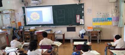 1年生の図画工作の授業です。学習園でしっかり観察したヒマワリを思い出したり、先生がパソコンでスクリーンに映したヒマワリの写真を参考にして、画用紙いっぱいに自分がイメージしたヒマワリを描いていました。