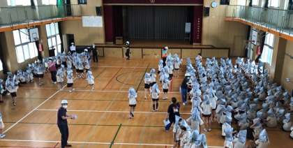 揺れがおさまったので、防災頭巾をかぶって避難します。(今日は雨天だったので講堂に避難しました。)