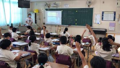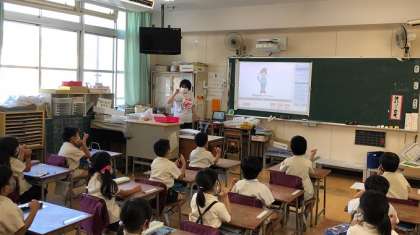 火曜日と金曜日の13時45分からの10分間は、英語の短時間学習です。1年生もスクリーンの映像を見ながら、手遊び歌で英語に親しんでいます。