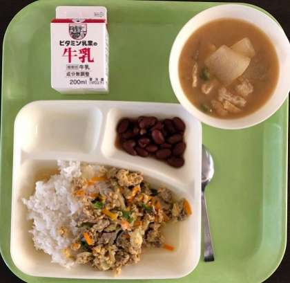 9月15日(火)の献立は、 他人どんぶり 冬瓜のみそしる 金時豆の煮もの 牛乳 でした。