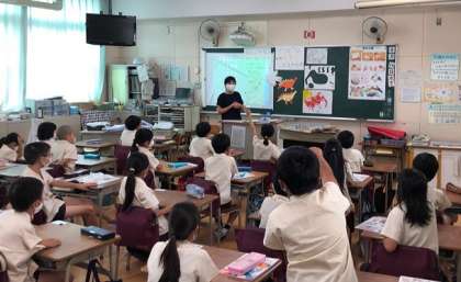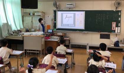 1年生の国語の学習です。カタカナの習得学習を続けています。黒板には、デジタル教科書の画像がプロジェクターで投影されていますが、実は、筆順も動画で示してくれます。子どもたちにとってもわかりやいですね。