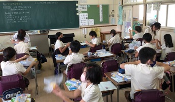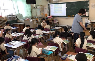 5年生の算数の学習の様子です。「平均」について、学習を進めていますが、歩幅を使って道のりを計算するのが目当てです。10歩の平均、1歩の平均を求めてから、何歩あるかを図り計算しますが、どちらの方が良いかグループで話し合っています。