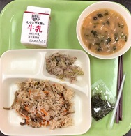 10月5日(月)の献立は 牛肉のきんぴらちらし みそ汁 キャベツの赤じそあえ でした。