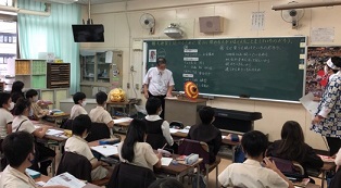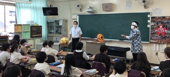 今日のテーマは「天神祭りを支える人々」なのですが、何と副読本「私たちの大阪」に写真やコメントが載っている「天神講獅子」(獅子舞と傘踊りで祭りを盛り上げる講)の講元、森本さんが祭りで実際に使う獅子や傘をもって教室に来てくださいました。子どもたちは「あっ 本物の森本さんや」とびっくり。(写真上)