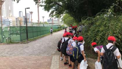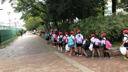 秋を感じられるものを見つけて袋に入れています。生活科の学習、秋見つけです。