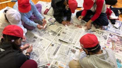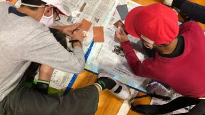 本来ならば、研修室やクラフト室など、机のあるところでの活動ですが、コロナ対応で入室者制限があり体育館での活動です。