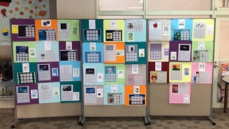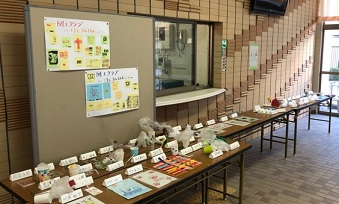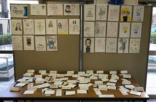 写真は上から、パソコンクラブ、図工クラブ、イラストクラブの作品展示です。