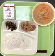 2月10日(水)の献立は、 まぐろの甘辛焼き 豚汁 くきわかめのつくだ煮 ごはん 牛乳 でした。