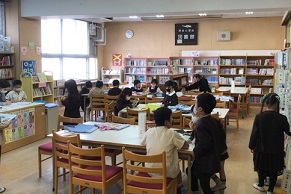 1年生の学習の様子です。週に1時間、図書室にいって学習します。先生に絵本の読み聞かせをしてもらった後、先週借りた本を返却し、新しく借りる本を探したり、図鑑などを見たりして読書に親しんでいます。今は、貸し借りもパソコンでバーコードを読んで管理できるのでずいぶんと楽になりました。