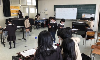2年生の音楽の学習の様子です。音楽室に行って、「夕やけ こやけ」を木琴、鉄筋で演奏することにチャレンジです。