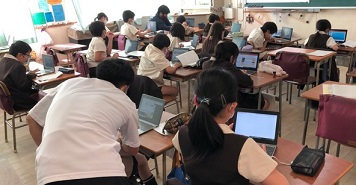 5年生の総合的な学習の様子です。9月の自然体験学習で訪れる「びわ湖」について、調べたことをパソコンにまとめています。