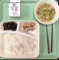 5月10日(月)の献立は、 さけのごまみそ焼き 五目汁 ひじきの炒め煮 ごはん 牛乳 でした。